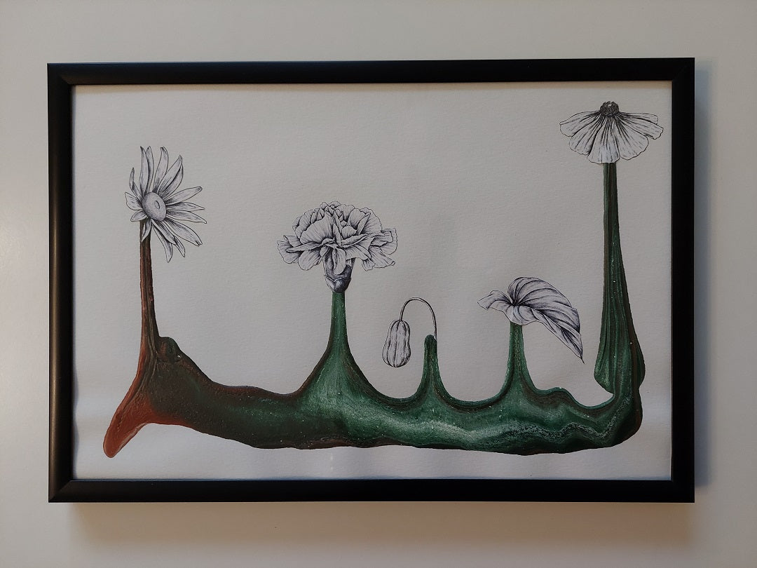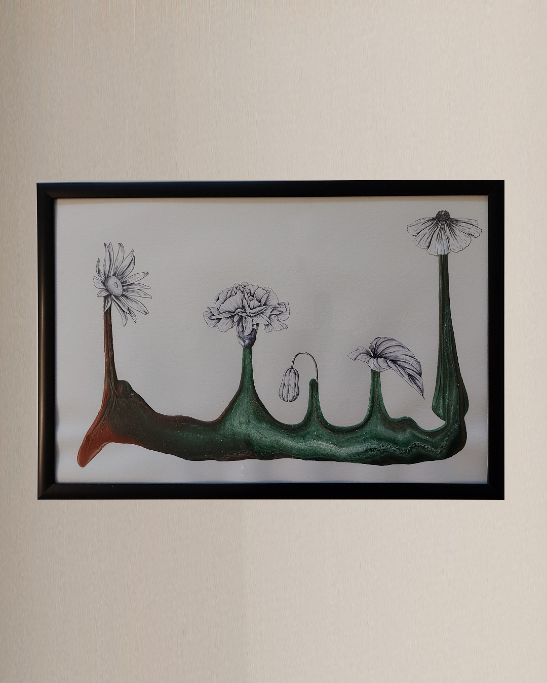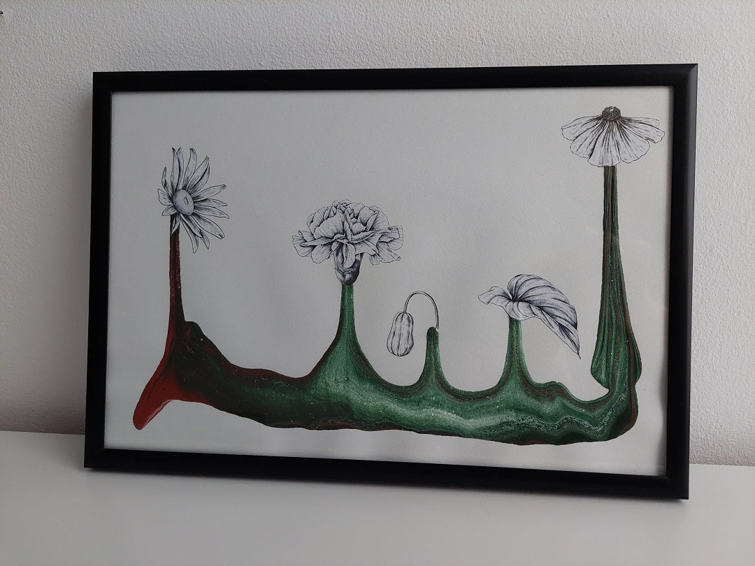 Framed acrylic painting on paper, manufactured with acrylic pouring technique combined with collage elements.